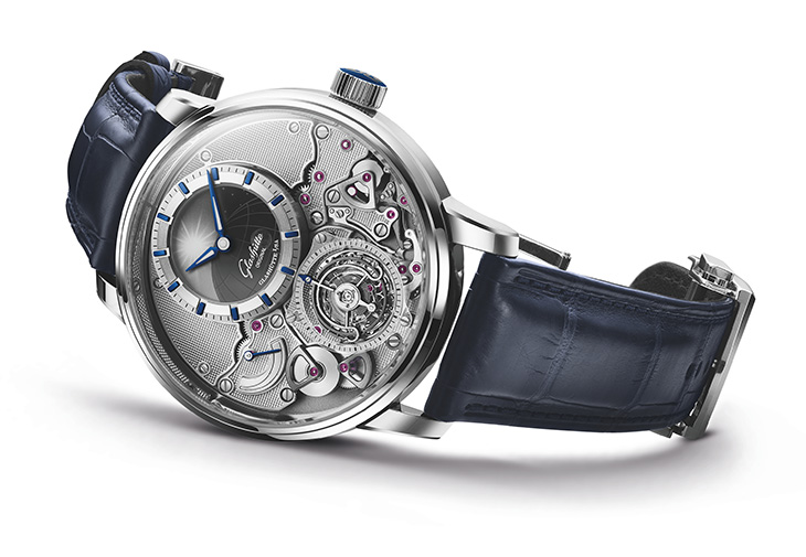 如今陀飛輪技術門檻看似解封,如何進化仍舊考驗品牌機械實力。格拉蘇蒂原創的議員天文台陀飛輪腕錶便以德國原產的飛行陀飛輪,加上專利停秒歸零與分針分離止動機制展現複雜專業並傳達對精準的執著。