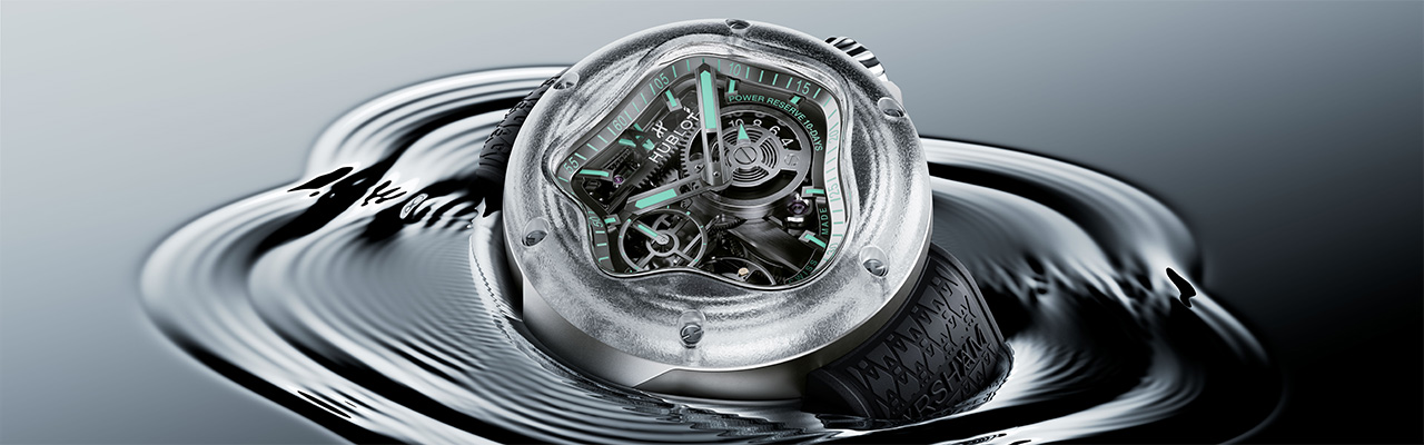 繼MP-16《Arsham Droplet》之後,今年HUBLOT宇舶再度與品牌大使暨藝術家Daniel Arsham合作推出MP-17 Arsham Splash。以水為靈感,再展藝術高度與全方位製錶實力。這款把「水的形狀」直接做成錶殼造型,更不規則、更流動的輪廓,搭配首次嘗試的磨砂藍寶石水晶,將原本晶透的質地轉化為霧面半透明、近看帶皮革紋理般的琉璃觸感,營造彷彿置身水下、因折射而失真的視覺錯覺。