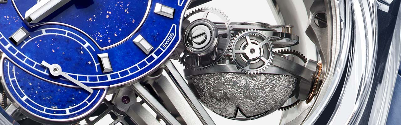 為了展示這複雜的系統,能從各角度欣賞內在的藍寶石錶殼是最佳載體,透明藍寶石版本展示著如同懸浮於空間中的機械雕塑,而星空藍版本則在透明中注入深邃的宇宙色調;天然青金石面盤上點綴著自然融合的金色黃鐵礦,每一只面盤都有獨一無二的天然紋理,宛如將星空凝結於方寸之間。