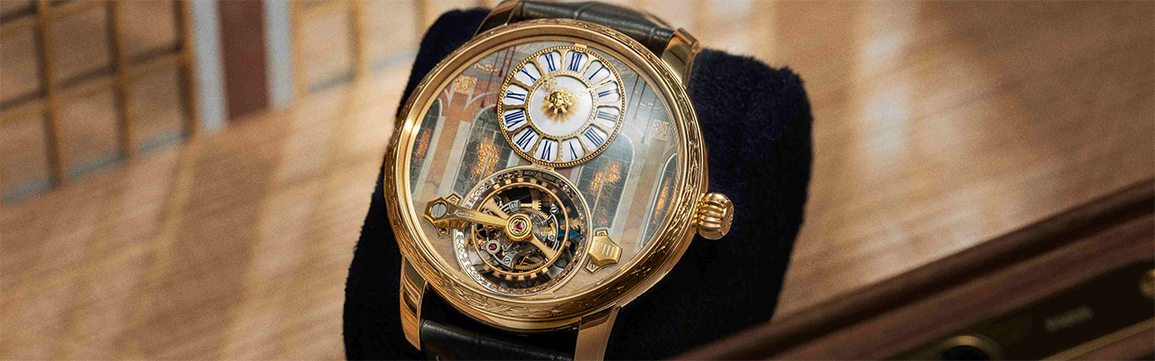 相傳,派對上包括國王路易十五和其隨從都打扮成巨大的紫杉樹雕塑,穿梭於擁擠的舞廳之中,這與其一段情史有關。明星傳承系列懸浮外置陀飛輪腕錶的面盤不只重現這場宴會的鏡廳場景,連垂掛的吊燈和賓客身影都細緻再現。