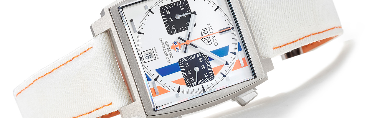 雖說這前提只建立在錶主只有一只腕錶的情況,卻也是個有趣的說法。但不管實際考量為何,這確實也更加深了Monaco Chronograph × Gulf與當年初代版本的連結。限量971只,暗示電影上映的1971年。與面盤色調相同,有著橙色縫線的白色織物錶帶,配色與材質都與電影中的車衣相同,讓致意的意象更首尾呼應。