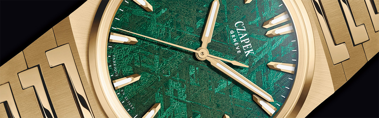 此款式先前發表的不鏽鋼版本已興起收藏熱潮,這次搭配黃金材質氛圍更華美。Green Meteor非傳統寶石,卻是選用來自納米比亞的Gibeon隕石,透過酸蝕工藝呈現的結晶Widmanstätten結構,再覆以半透明綠色漆層,營造出神秘深邃的視覺效果。