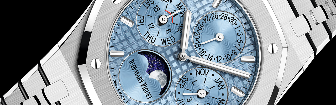 愛彼AUDEMARS PIGUET在150週年慶祝浪潮中,把「皇家橡樹萬年曆」推向更貼近日常佩戴的尺寸,繼年初41mm新作後,品牌追加推出3款38mm萬年曆,這是愛彼首次在38mm時計中導入萬年曆複雜功能。其中不鏽鋼Royal Oak搭配淡藍色PVD Grande Tapisserie大型格紋面盤,並搭載全新7136機芯,最大亮點是所有日曆校正皆可透過錶冠完成,大幅降低傳統萬年曆在調校時的麻煩;再加上 9 點盤面的紅色「非校正區」提示,以及6點鐘取自NASA月球影像的月相,讓這只38mm萬年曆既精準好用、又有十足的收藏話題。
