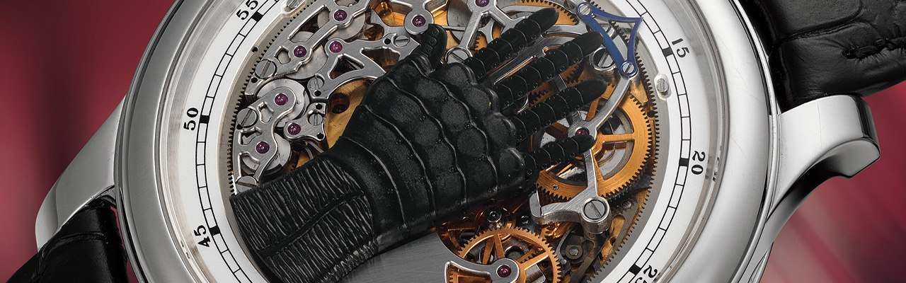 這只前衛腕錶源於2012年柯波拉款待製錶師Journe時,隨口提問能否用機械人手來顯示時間。後來Journe從16世紀設計的機械義肢汲取靈感,歷經七年研發,終於實現以五根金屬手指指示12小時的機械奇蹟。所以兩只原型錶就由兩人各得其一,這次拍賣的就是柯波拉藏品。