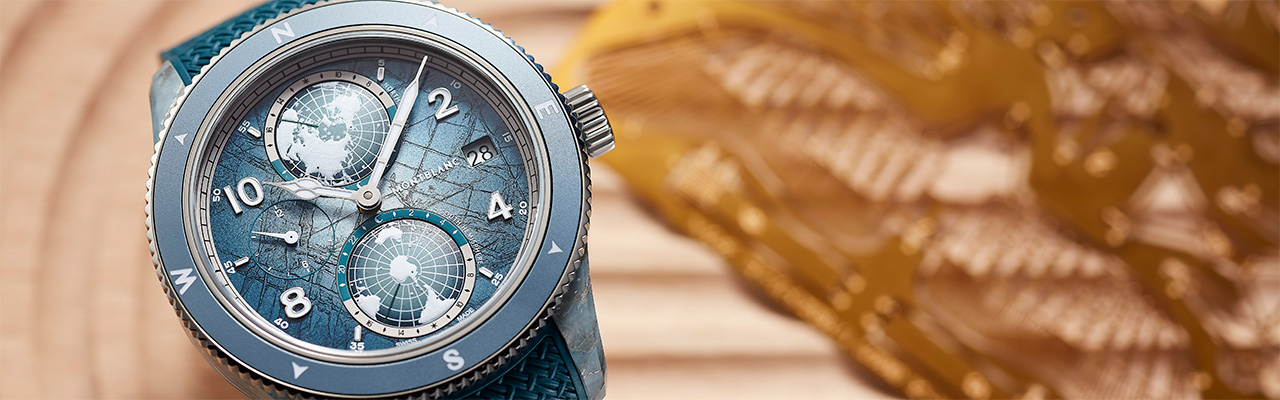 錶款的面盤同樣採用飾有藍綠色和淺灰色暈染冰川圖案,這已成為萬寶龍最常使用的面盤飾紋,而淺灰色陽極氧化鋁金屬錶圈則是搭配藍色夜光羅盤方位,不論白天夜晚皆能判讀資訊。面盤上有兩個逆時針旋轉的立體地球儀,分別代表北半球和南半球,並提供24小時晝夜指示,可讓佩戴者輕鬆讀取世界不同地點的時間。