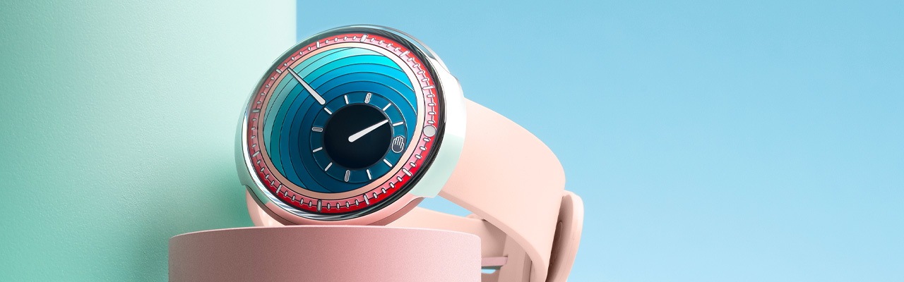 另兩款與德國藝術家 Daniel Engelberg 推出各限量 40 只的 TYPE 8 DE1 與 DE2,將品牌的極簡理念與藝術家以幾何與色彩構築的視覺語彙結合。TYPE 8 DE1 採溫潤柔和的粉色調,DE2 則以綠松石色展現鮮明亮彩,兩款配色皆源自 Engelberg 的「Inside Out」系列,其核心特色為同心圓構圖與視覺深度幻象。