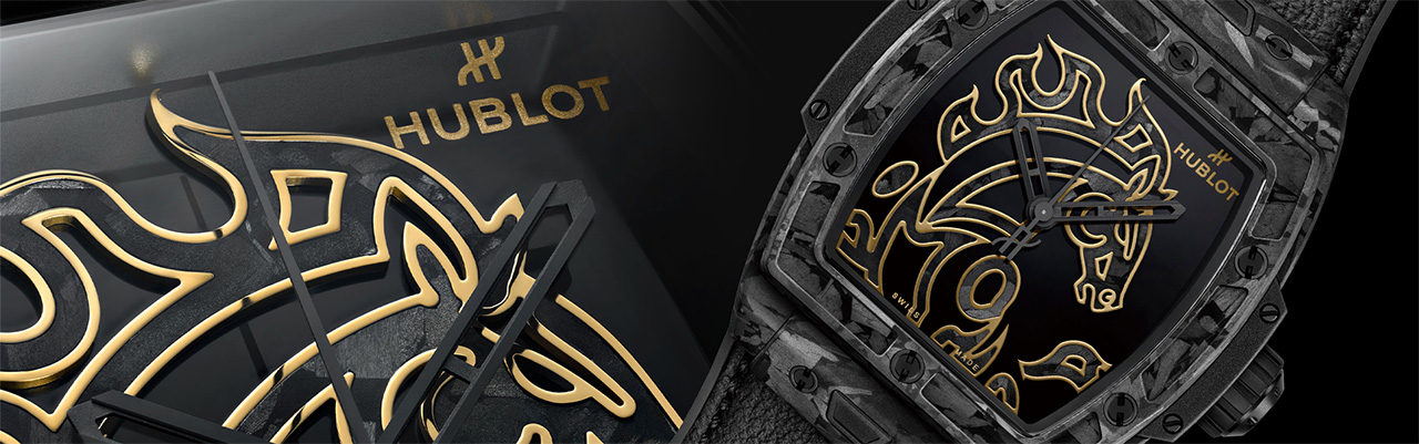 為新春開啟強運,Hublot以霜狀碳纖維細工鑲嵌與金線雕藝,打造象徵力量、氣勢的「黑馬」主題腕錶。