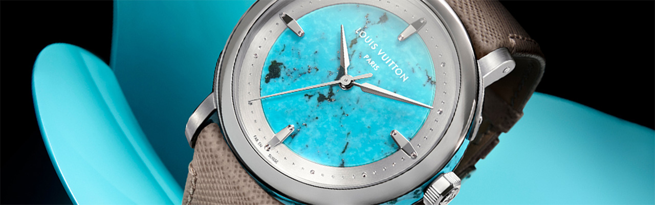 正裝錶風格重新受到市場關注之際,Louis Vuitton 則以嶄新材質語彙為經典設計注入藝術氣息。2025 年推出的 Louis Vuitton Escale 寶石腕錶,首度將綠松石與孔雀石同時運用於面盤與錶殼之上,結合標誌性的行李箱結構元素,展現品牌獨有的旅行美學與高級製錶實力。