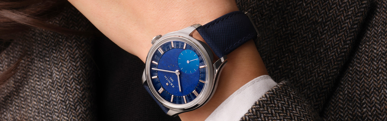 未來的款式到時候再說,回頭看看當今這款,從外到內滿載迷人的工藝細節以及精準本質。面盤時標環雕刻出如錶廠外牆的磚形圖案,以手工鑲嵌的白金材質時標與金珠分鐘刻度,在光線下閃爍著低調而優雅的光澤。面盤中央選用天然青金石製作,湛藍中點綴天然紋理,宛如幽藍夜空,呼應著ZENITH的「天頂」字義。6時位置的小秒針盤則採用珍珠母貝,變化的光影與沉穩的青金石形成鮮明對比。多層次、多材質的面盤設計在現代鐘錶中並不罕見,但真力時還融入品牌元素,讓各種質地在遠觀時和諧平衡,近看時又各自展現雅致的細節。