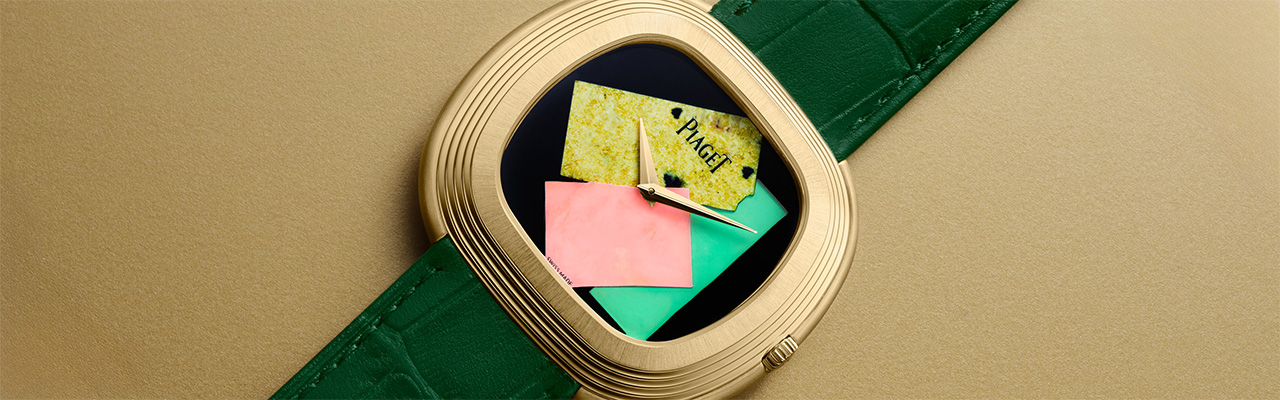 手錶面盤共使用了黑瑪瑙、黃色蛇紋石、粉紅蛋白石和綠玉髓四種寶石組合完成。面盤底板使用黑瑪瑙,正是連結Andy Warhol本人在1973年所擁有的PIAGET手錶色調。其次運用方塊切割的寶石加以鑲嵌拼貼,黃色蛇紋石、粉紅蛋白石和綠玉髓的亮黃色、淡粉色與青綠色帶來鮮豔明亮的繽紛視覺,其銳利的塊狀視覺呈現同時也突顯出Andy Warhol作品中的標誌藝術風格。