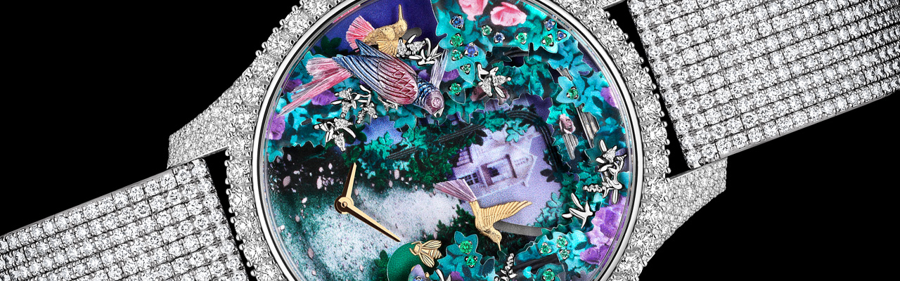 向Christian Dior的童年故居 Rhumbs 別墅及其蔥鬱花園致敬——這裡正是年輕的高級訂製服設計師最初孕育夢想與想像的地方。由珍珠母貝葉片與鑲嵌黃金枝條構築而成的場景,勾勒出一條浪漫蜿蜒的小徑,並透過自動裝置機械結構,讓鸚鵡、蜂鳥、蜜蜂與蝴蝶在錶盤上翩然甦醒。於這幅珍貴畫面核心之處,家族宅邸的立面在背景中若隱若現,四周環繞著交織和諧的玫瑰叢,其花朵以閃耀寶石為心,綻放迷人光彩。