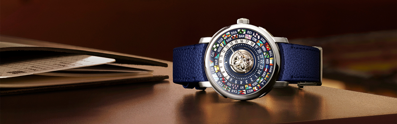 Escale Worldtime腕錶面盤外圍是微繪彩色城市圈,中央則是顆粒紋的藍色面盤,令人聯想起Monogram帆布的質感。由於搭載新研發的LFT VO 12.01自動上鍊機芯,顯時方式與過去以固定箭頭指示內外側交疊的獨立顯示圓盤不同,改採用跳時機械結構,以指針搭配24小時環設計,同樣可以清晰顯示全球24個時區時間,佈局更簡潔俐落。透過錶冠就可以調校參考城市和時間。