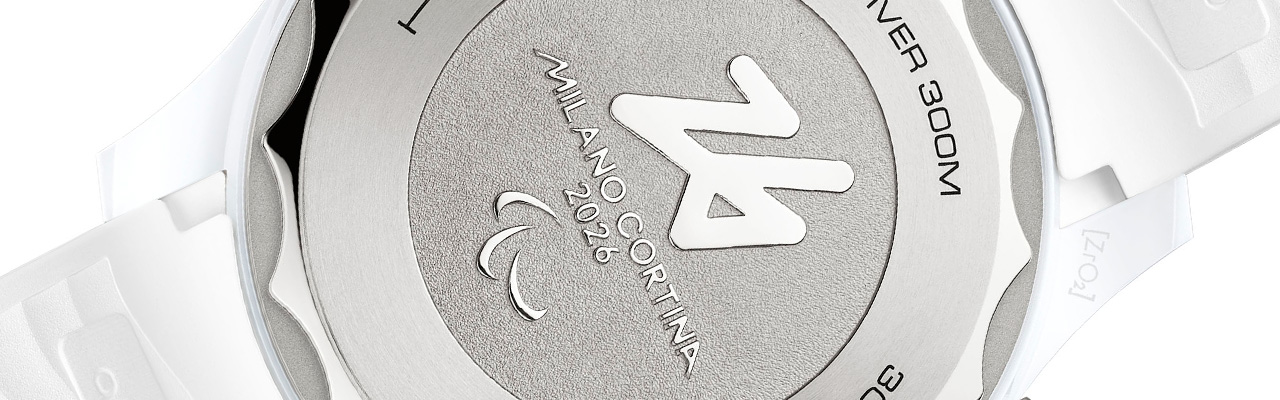 錶盤同樣展現獨特設計巧思,以向本屆冬季帕運會致敬 。錶盤由白色陶瓷製成,表面經雷射雕刻呈現冰霜質感,並加入靈感來自 Milano Cortina 2026 標誌中「26」數字的指紋紋理圖案 。完成整體視覺設計的還包括鍍銠指針與時標,並填覆白色 Super-LumiNova 超螢光塗層;而亮漆中央秒針則特別採用紅、藍、綠色漸層點綴,這些色彩正與本屆賽會標誌相互呼應 。
