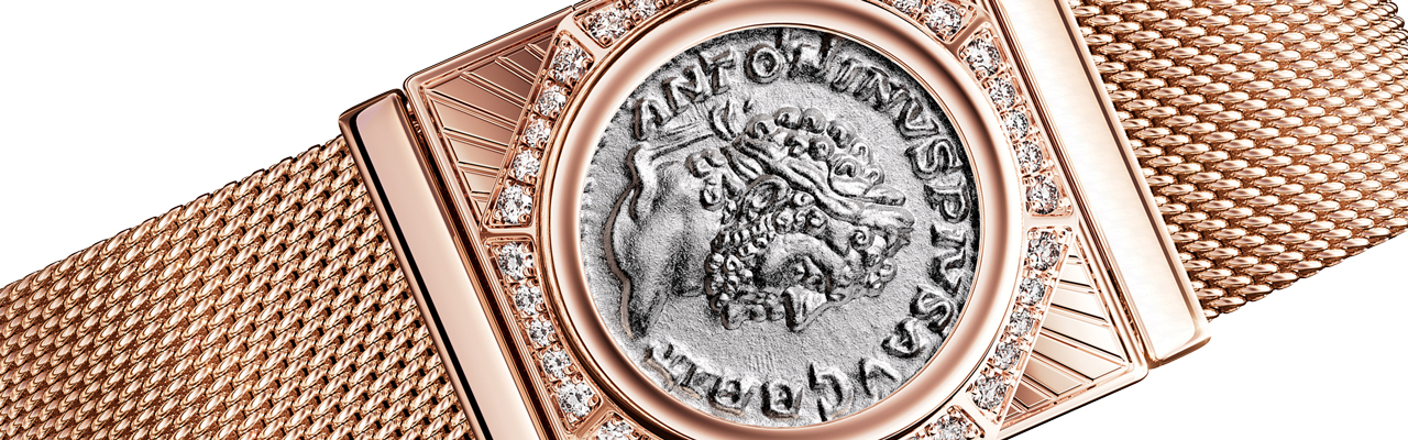 此錶重新詮釋寶格麗在1960年代中期推出的Monete經典錶款,為體現古羅馬文明的文化魅力,腕錶錶蓋上裝飾鐫刻卡拉卡拉大帝古羅馬銀幣,此次首度結合米蘭錶帶的傳統工藝,展現細膩柔軟的配戴質感。由於搭載纖小的Piccolissimo微型機芯,賦予設計與裝飾更多發揮空間。