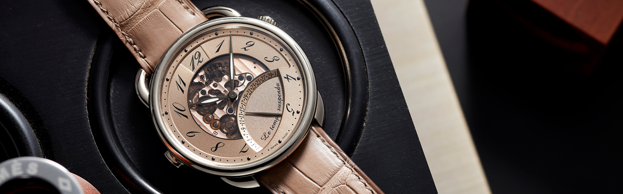 愛馬仕HERMÈS的品牌風格總是帶些浪漫情調,正是因為這份天馬行空的奇想,才促使其能夠打造出彷彿能將時間停止的Arceau Le temps suspendu暫停時間腕錶,透過專利機械模組與逆跳顯示結構,讓時分針與日期指示在按下按鈕後瞬間「消失」,營造彷彿時間被暫停的奇妙體驗。