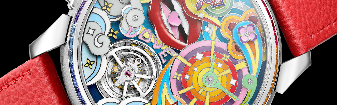 Tambour Taiko Arty Automata 腕錶完美融合創意設計、超凡工藝與精湛製錶工藝,凝聚路易威登最前衛高級製錶作品的所有標誌性元素。這是一款令人愉悅的 Monogram 花朵能量傑作,在如彩虹般夢幻的愛之流動景致中,呈現出一場受普普藝術啟發、層層堆疊出的視覺盛宴。