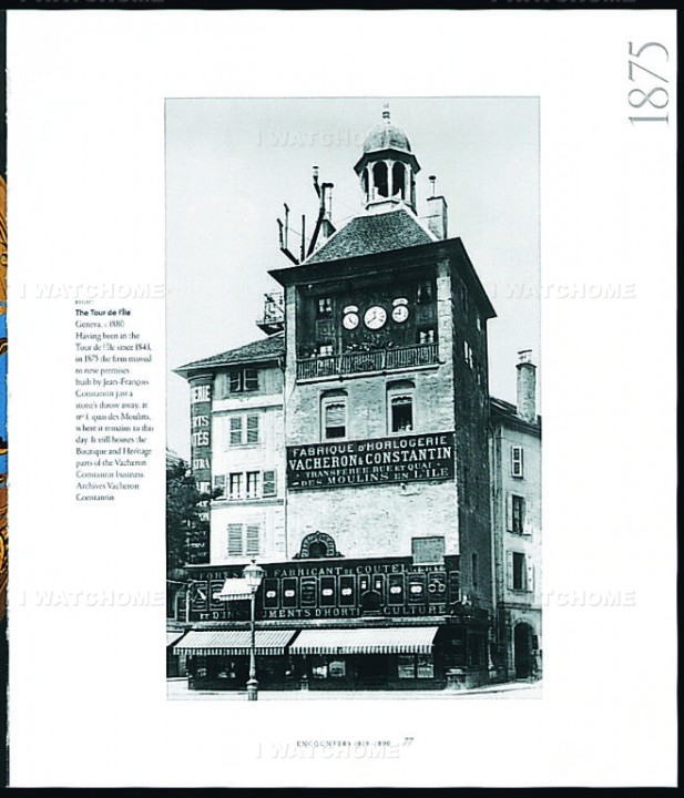 1843年時,江詩丹頓遷到了日內瓦著名的地標 Tour de ľÎle 鐘樓下,這座建築於13世紀時的建築物有著比原來更大的空間;因為是古建築、同時有著獨特的歷史意義,因此在江詩丹頓的錶上也能見到這棟建物的浮雕,原本鐘塔上有著一個大鐘;到1858年時,日內瓦與法國巴黎之間的鐵路開始營運,因此鐘塔上換成了三個較小的鐘,分別顯示日內瓦、伯爾尼(Berne)以及巴黎時間,方便火車乘客比對時刻表;直到1875年,江詩丹頓才遷出了這個有著重大歷史價值的鐘樓。