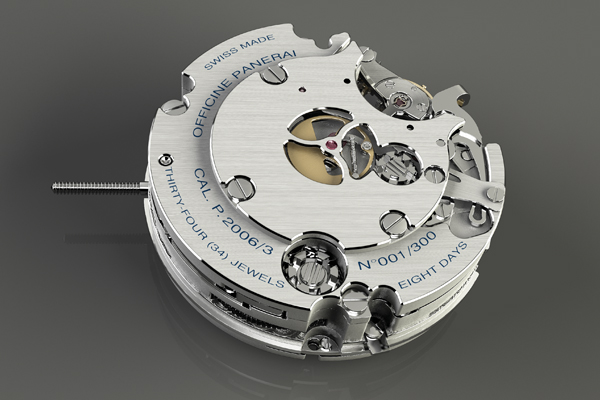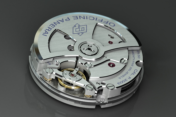 P.2003是沛納海自製的第一枚自動上鍊機芯,同樣是三發條盒,兩地時間功能。不過動力儲存高達10日。充沛的動力,也是品牌動力儲存最久的一枚機芯。