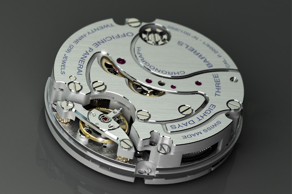 大多品牌發表自製機芯的順序,先是一般基本三針,接著再出現的通常會是計時碼錶,為什麼?可能是因為計時碼錶的機制感覺很厲害。沛納海廣義上也循了這個順序,第二枚發表的自製機芯P.2004,便擁有計時碼錶功能。但這卻不是一般的計時碼錶,P.2004是一枚單按把計時機芯,同時也擁有八日動力儲存與兩地時間功能。在設計時,因為以考量到若裝配在Luminor錶殼內時,按把位置可能會與錶冠護橋有衝突,因此將按鈕設計在八點鐘位置,以避免破壞錶冠護橋的整體性。