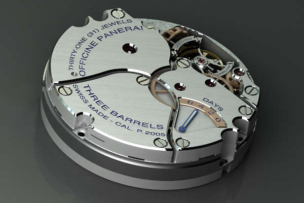 沛納海在自製的第三枚機芯P.2005上就加入了陀飛輪功能,而且,這並不是一般的陀飛輪。立體的陀飛輪框架與機芯機板保持垂直而非平行的運作,每30秒轉一圈,比一般陀飛輪更快。理論上能夠更針對腕錶實際使用來抵銷地心引力的影響,確保腕錶更高的精準度。