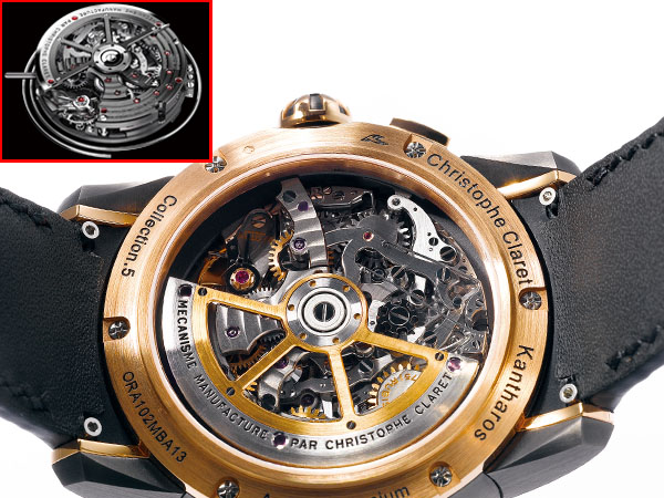 前面提到,Claret在他自有品牌的錶款中,幾乎都加入了有關問錶的概念,而2013年的新款主角Kantharos,就是結合了計時碼錶與自鳴問錶的設計,另外在計時碼錶的結構亦有革新,最後更有恆定動力系統加入,讓Kantharos在視覺、聽覺與精確度上均有出色表現。