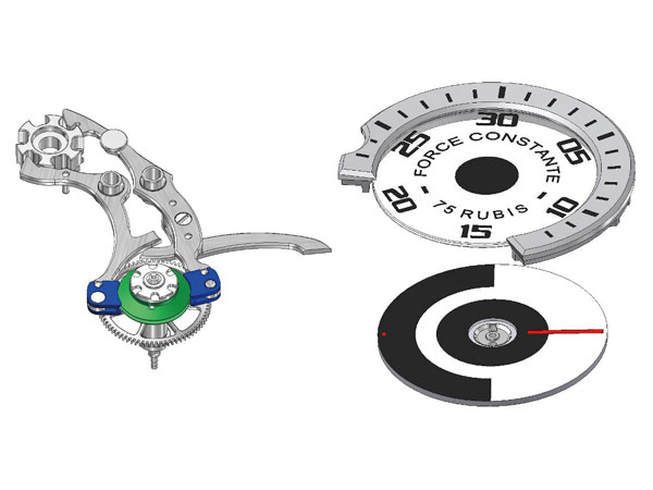 至於恆定動力系統則是首度出現,主要在秒針輪上加入另一組擒縱裝置,包括游絲、四爪擒縱叉、擒縱輪、衛星輪系等等,讓來自發條盒的動力能夠規律、穩定的輸入機芯走時的擒縱系統,其恆定動力系統固定於藍寶石水晶夾板上,會每秒運作一次。