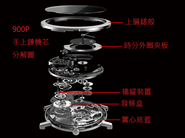所謂合而為一,是指900P將錶殼底部直接作為機芯的基板,所有的齒輪是從錶殼底部開始組裝,最後再把藍寶石水晶鏡面蓋上,即完成整個腕錶。因為不同於過去先裝好機芯、再把機芯裝入錶殼的工序,故無需考慮錶殼與機芯之間的配合,也不需擔心開發時顧此失彼。900P機芯即代表一枚完整的腕錶、Altiplano手上鍊腕錶就是900P機芯,厚度也降至3.65mm,打破2013年才由集團內其他品牌創下的4.05mm紀錄,成為目前世界最薄的手上鍊腕錶。
