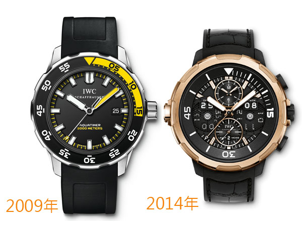 相隔五年之後,IWC在2009年發表採用旋轉外錶圈設計的海洋時計系列,為了提升錶款抗磨損的能力,因此特別在錶圈上方加裝藍寶石水晶玻璃,其下方則是塗抹夜光塗料,即使在夜間或黑暗處,也能清楚判定時間;此外,本系列也開始採用自製的89361自動計時機芯。