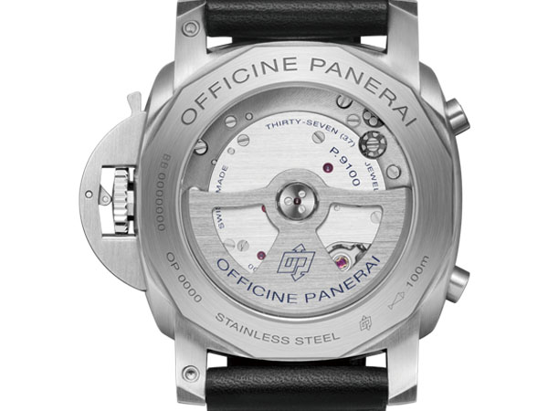 P.9100計時機芯同樣採用雙發條盒設計,具有72小時的動力儲存。另外,機芯使用可雙向上鍊的棘爪式上鍊系統,以及陶瓷滾珠軸承,具備高效率的上鍊效能。拉出錶冠便可歸零的小秒針結構,可單獨快調短時針的設計,以及微調螺絲擺輪與自由收放游絲的組合,也都是沛納海自製機芯的特色之一。未來P.9100系列機芯,將取代現有的ETA計時機芯,成為自動計時機芯的新主力,其優異的規格設計,相信能符合沛納海原有的期待與發展潛能。