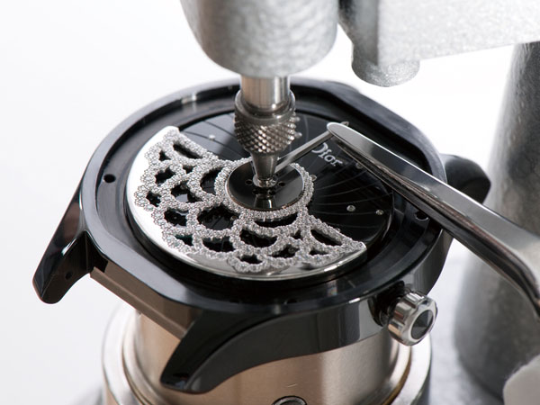 DIOR的錶廠座落於瑞士La Chaux-de-Fonds,由於品牌採通用機芯或委外製作,因此DIOR VIII與其他腕錶相同,都是從打造面盤開始製作,無論是浮雕圖案的壓印機、雕刻、拋光、噴補以決定鑲嵌的位置,及鑽石基座的銑削處理等等,在Core Range系列面盤中央的一圈鑽,還有鑲鑽錶圈,或是Baguettes系列錶圈上排列工整的珍貴彩色寶石,除了選石與切工,鑲爪的固定也是門學問,仔細鑲嵌後也得在放大鏡下嚴格審視其美感,還有寶石的鑲面是否平滑等。