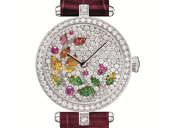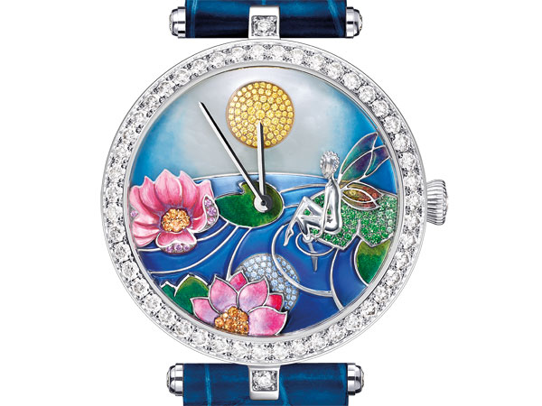 除了新結構的Lady Arpels Ronde des Paillons,今年梵克雅寶也推出數款不同設計的詩意複雜錶款。錶款運用貴重寶石鑲嵌、金雕、琺瑯技巧創造出華麗的自然花卉樣貌。緣於2005年Fée Ondine胸針的Lady Arpels Jour Fée Ondine腕錶,採用雙層錶盤,專利的二十四小時模組轉盤置於下層,隨時間緩緩轉動,轉動出蓮池的日夜風光。