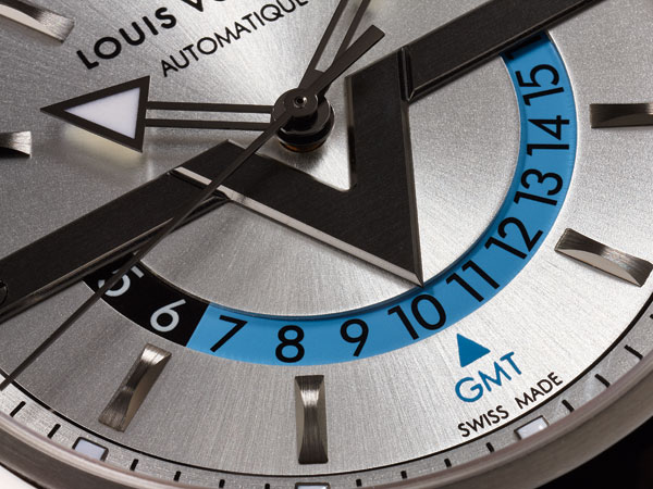 面盤中央的大型V字也是錶款的一大亮點,這個V象徵式地隱藏了很多符碼在裡頭,V字出自LV家族傳人Gaston-Louis Vuitton的設計,除了彷彿是簽名式的宣示之外,也是平衡整個面盤的視覺重心,而第二地時間的半圓盤也以中央的大V字為支點,巧妙地和12點鐘的V做為呼應。