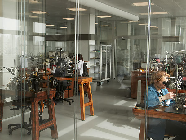 積家的複雜機械實力有目共睹,而這次主要參觀的是2016年初才整合完成的工藝部門。將過往散落在各處,負責各種裝飾的單位集結,金雕、珠寶鑲嵌、甚至琺瑯彩繪部門都集中在一起。完成這一建置,讓積家從設計、機械零件,到組裝、裝飾,以及高端工藝都能在單一錶廠中完成。最大的好處,自然是增加組織的溝通與效率。