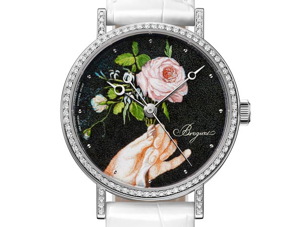 凡爾賽玫瑰主題的這款Classique 9078彩繪琺瑯腕錶是以1783年伊麗莎白‧維絲‐勒‧布倫(ElisabethLouise Vigée-LeBrun)所繪的《瑪麗•安托瓦內特與玫瑰》肖像畫為靈感而來。原畫是瑪麗皇后手持玫瑰的全身肖像,寶璣則是取手持玫瑰的部分在面盤上重現,繪畫細緻,值得細細品味。