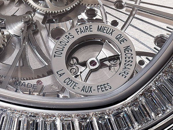 壓按九點鐘位置錶側的鑲鑽滑桿,可見面盤五點鐘位置的調速器迅速轉動,啟動三問。伯爵以科學的態度追求純淨音色。三問音量維持在約莫一般對話的64分貝,音調則是五個八度,高音的報時為升G,較低音的報時則是升A,以為清脆。而聲音的延滯係數則是被認為恰到好處的2600,不疾不徐,餘韻猶存不沾黏。雖說追求超薄,但伯爵並未遺忘三問最重要的還是在於聲響的表現。