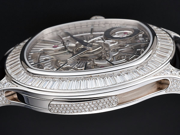 超薄另一關鍵則在錶殼。Emperador Coussin XL錶殼由69枚細部零件組成,厚度只有9.4mm,以問錶來說當真纖薄。為了在錶殼內能留有足夠共鳴空間,採用與機芯同樣的橫向發展概念,錶殼直徑48mm,中間盡可能雕空,保留共鳴的空間。並運用四枚支架將機芯固定於錶殼內,讓音簧獲得更好的共振效果。於內,是如何在維持鋼性與結構美觀下,鑿出更多內部空間。於外,則是以耀眼的T鑽編排出的閃閃火光,華麗動人,也巧妙訴說伯爵在機械與珠寶工藝之間追求。