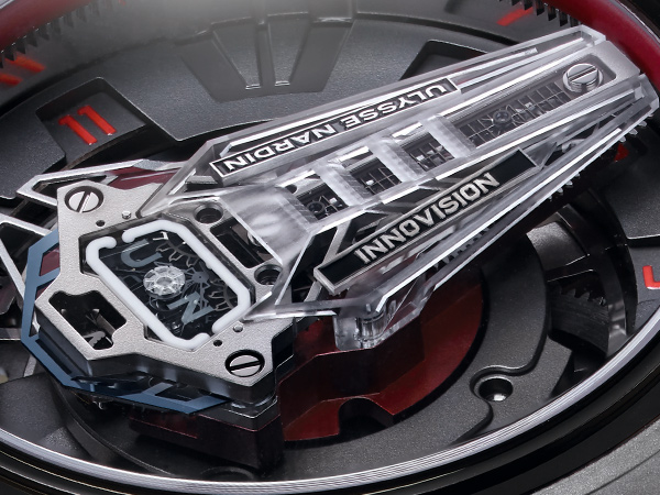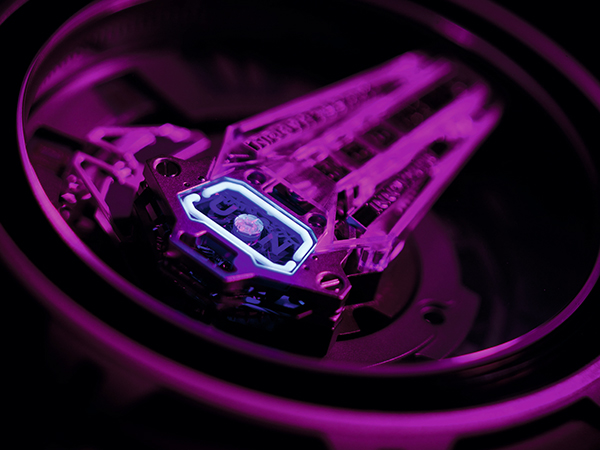 《InnoVision 2》的嶄新擺輪橋板前所未見——由透明玻璃製成,給予工程師、材質科學家無限可能。其中一項可能性,便是以Super LumiNova注滿玻璃中的精細管道,實屬非凡意念。Super-LumiNova是一種磷光顏料,其與日光或人造光接觸後,便會發光數小時。玻璃擺輪橋板中的管道注滿Super-LumiNova,在黑暗中散迷人光芒。