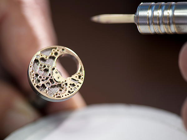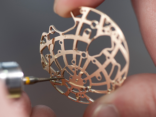 一切由研究機芯的結構圖開始,必須先找出維持機芯運作必須保留的部分,才可設計圖案。然後,鏤雕師以細小的刻刀和細工鋸在作品之上雕刻出預先繪畫的圖案。要完成積家101型機芯的鏤空工作,鏤雕師需要在總重0.98克的機芯之上移除0.2克的材質,整個過程需時三個星期方可完成。