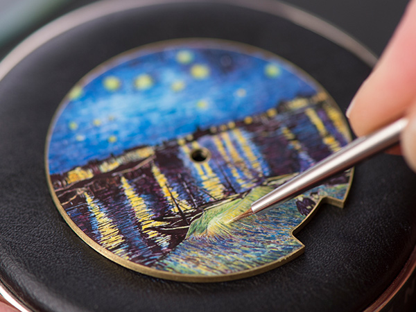 隨後須覆蓋六至八層透明琺瑯,以保護錶盤,再透過打磨和拋光令表面變得光滑亮麗。作品需要進出火爐17到22次,以營造玻璃化效果。每次進爐,琺瑯都有破裂的風險,令多個小時的心血付諸流水。然而,珍稀工藝(Metier RareR)工作坊的琺瑯大師無懼風險與實驗。不論是以琺瑯搭配扭索飾紋,還是琺瑯微繪工藝,他們總是孜孜不倦,在熊熊烈火之中尋回古老技法或研發新的技巧。