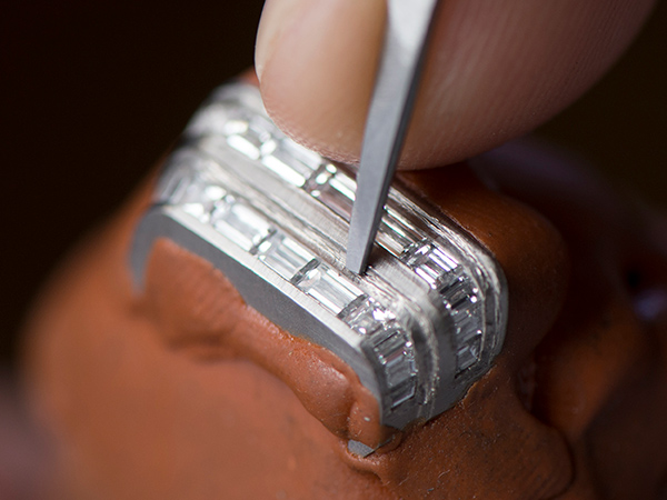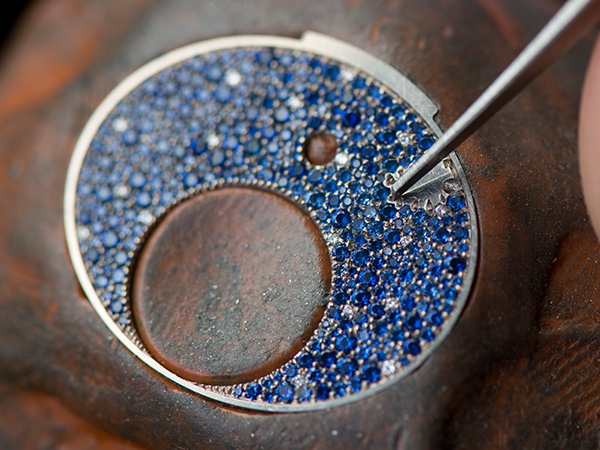 用於高級珠寶腕錶或經典錶款之上的積家鑲嵌工藝,其意在於觸動佩戴者的心靈,呈現令人賞心悅目的傑作,而非製作以寶石堆砌而成的腕錶。選定寶石後,工匠便在材質上鑽孔,以便在這些空間放置寶石,然後將鑽孔外圍的材質推成圓珠狀以固定寶石。工匠可選用不同的技術,如傳統的粒面鑲嵌技術,以四個小鑲釘抓緊大小相同的寶石,另外還有方形鑲嵌和密封式鑲嵌。