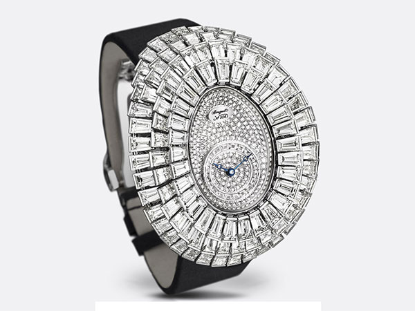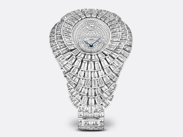 這樣的設計不僅增添了動態美,同時似乎也賦予了璀璨鑽石花朵鮮活的生命。Crazy Flower Full Baguette腕錶配置了7層的鑽石花辮,視覺效果最是華麗。從感性的方面來看,佩戴者的一舉一動都能讓鑽石花隨之起舞,人與錶之間也多了一層詩意的聯繫。
