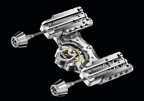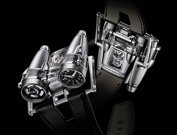 圖文:HM4雷霆錶將比一般水平面盤錶款更容易讀取時間,錶殼內的並聯式雙主發條盒可提供 72 小時動力,透過垂直齒輪輪系傳送動力面盤上的時針與分針,整體錶殼造型取法飛機噴射引擎的流線造型,打造出猶如太空載具的雙夾艙。