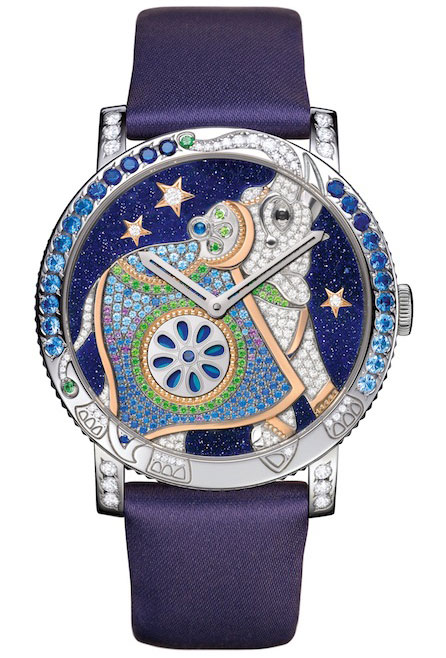 伯敻(Boucheron)Crazy Hathi瘋迷大象系列腕錶,面盤上多彩多姿的大象圖案,從東方文化中萃取歡愉丰采,因此不但表現出絕佳珠寶鑲工與細膩製作手法,甚至融入印度文化的濃郁風采,才真令人拍案叫絕。瘋迷大象系列腕錶有兩款風格迥異的設計,完美演譯截然不同風情。瘋迷大象星夜寶藍錶款表現夜幕低垂的神秘星空,鑲嵌藍寶石和綠色沙佛萊石;而瘋迷大象光燦粉紅錶款則以黃色和橘色剛玉共同呈現印度寶萊塢的奢華熱鬧氣氛。榮獲2011年日內瓦鐘錶大賞的最佳女錶首獎,可謂實至名歸。