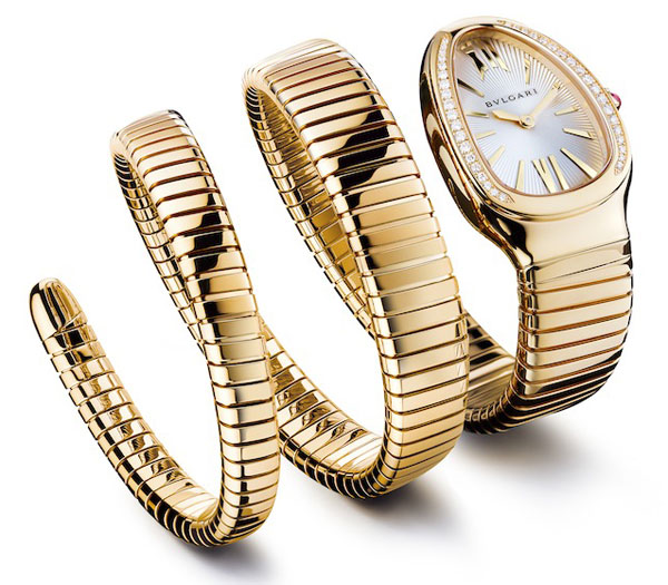 源自義大利的珠寶世家寶格麗(Bulgari),Serpenti蛇形系列腕錶最厲害之處,是將蛇形轉化為腕錶形體。令人意想不到,設計成一環、兩環甚至七環的蛇身造型手鐲錶身纏繞手腕,竟會如此動人耀眼且舒適服貼,沒有實際佩帶無法體會其中奧妙。這優勢來自獨家Tubogas 技藝,它以精鋼或黃金材質金屬薄片手工捲曲接合為一圈圈金屬環,完全不需焊接,僅依賴精細手工跟簡單工具完成。2011年所推出之新款 Serpenti 腕錶分別以黃K金或精鋼打造,有單環與雙環設計,某些款式還具有鑲鑽錶圈,展現大膽探求精緻工藝的魅力。