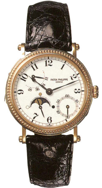 月齡錶特別要介紹的是PATAK PHILIPPE 5015,剛推出時曾經轟動一時,一直到現在都是拍賣會上錶迷爭相收藏的寵兒,也是筆者生命中的第一只百達翡麗。錶殼外圈的立體小珠點、白色仿瓷面盤、黑色的桃形復古指針、南瓜頭錶冠再加上可掀式後底蓋及透明錶背,這些都是令人心醉神迷的地方。這項最精準月齡錶的殊榮一直持續到2010年SIHH,積家錶自製了一只前所未有的月齡腕錶。