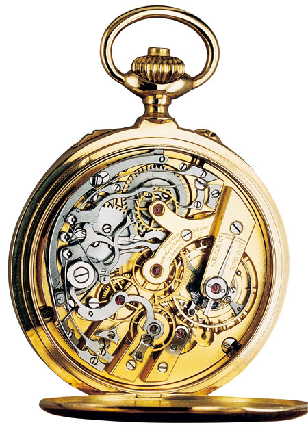 在這小小方寸之間,擠進了數百個零件、甚至上千個零件。從最簡單的手上鍊,時、分、秒針;到複雜的萬年曆,具有時、分、秒的基礎功能,多了星期、日期、月份、閏年、月相盈虧等功能;也有再增加計時、碼錶、30分計時,或再追加一支秒針,成為雙秒追針分段計時功能,有的還配上三問報時功能;更頂級的就是自鳴報時功能,也有極少數加上陀飛輪的獨特擒縱結構;綜合這些功能在一起,其零件數已接近 1000件,可以說是超級複雜的懷錶。