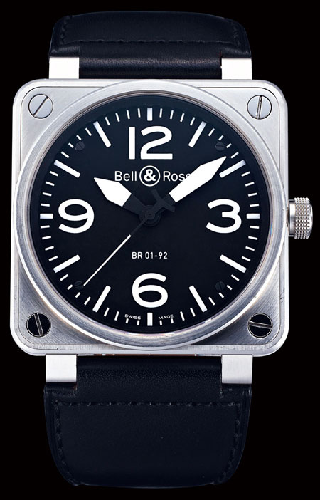 造型方正的BR01無疑是BELL & ROSS重振聲威的重要作品。錶殼正面四個角落的鎖牙螺絲提供搶眼的辨識度,如此的設計靈感來自於軍用飛機的儀表板,因為有如此設計背景,BR01-92在氣質上自然脫離不了強烈的運動感。遵循軍規習慣,造型簡潔俐落的設計,扣除多餘的裝飾,一切回歸到使用者的實際使用上,包括清楚易辨識的面盤,以及對撞擊的耐受度。此外,設計上也如同軍品般,該註記的錶款訊息皆清清楚楚的記載在錶背上。獨特的設計成就的獨特風格,堪稱經典的造型,成功塑造品牌的形象,也以此為基礎發展出許多錶款。這款BR01-92裝載ETA2892自動上鍊機芯,推出至今已經30多年,是許多知名品牌也都使用的通用基礎機芯,穩定、耐用,維修方便,品質無虞。