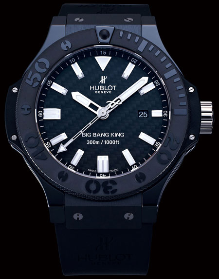 HUBLOT一向擅長運用大尺寸、黑色調、混搭材質等元素,加上充滿工業感的錶殼設計,讓錶款非常搶眼,這款Big Bang King Black Magic亦不意外,結合品牌諸多特質。精密打磨的黑色陶瓷錶身,除了強度夠高、防磨、防鏽蝕、抗過敏之外,重量也頗輕巧。因此錶殼雖然大到48mm但整體重量並不會造成手腕的負擔。比較讓人好奇的是這款腕錶設定為潛水錶,卻走黑色系,在水中是否會因為能見度不足而無法辨識?確實,當進入深水區中時,可見光會層層被過濾,使得肉眼可辨識的顏色越來越少,而Black Magic雖然錶身與Carbon面盤皆漆黑一片,但時標與指針卻是與之高反差的白色,加上夜光塗層之後,當能見度不足時,反差卻極大,也算搭配得宜。