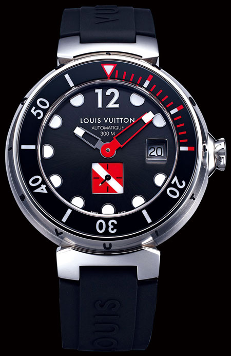 「LV」、「運動」、「潛水錶」,對於許多基本教義派錶迷而言這幾個詞該是平行線,不過在集團化的趨勢下,LVMH身為全球最大精品品牌,旗下整合數個專業製錶產業,包括TAG HEUER、ZENITH皆是,在互相支援合作下,所得到的結果必然是正面的。LV從2005年開始推出潛水錶,到了2011年才推出了第二代,延續系列一貫的華貴造型外,能力也有所提升。大型時標,簡易的面盤配置,方便閱時。單向旋轉錶圈、防水300米,實質的設計符合潛水運動的需求。六點鐘位置的紅白潛水旗圖案,更清楚強調錶款是專為潛水運動所設計的錶款。裝載ETA 2895.2自動上鍊機芯,是2892的小秒針版本,穩定耐用,方便維修。代表LV的圖案紋路也瀰漫在錶殼與錶帶上,讓運動錶款呈現出時尚的設計感。