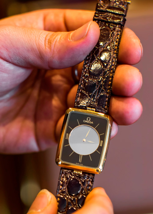 他又隨手拿起一只OMEGA歐米茄在1970年代的賽車錶Chronostop,操作方式異於常見的計時碼錶。第一次按下按把,秒針啟動;但第二下按下按把,必須持續按住按把,這時秒針處於停止狀態,方便讀取,然而一鬆開按把,秒針立刻歸零,凖備好下一輪計時,不同於凡俗的操作方式,讓這款歐米茄也成為他的藏品之一。